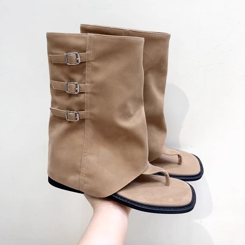 Summer new retro style belt buckle flat bottom toe open toe pants short boots women's medium tube herringbone cool boots