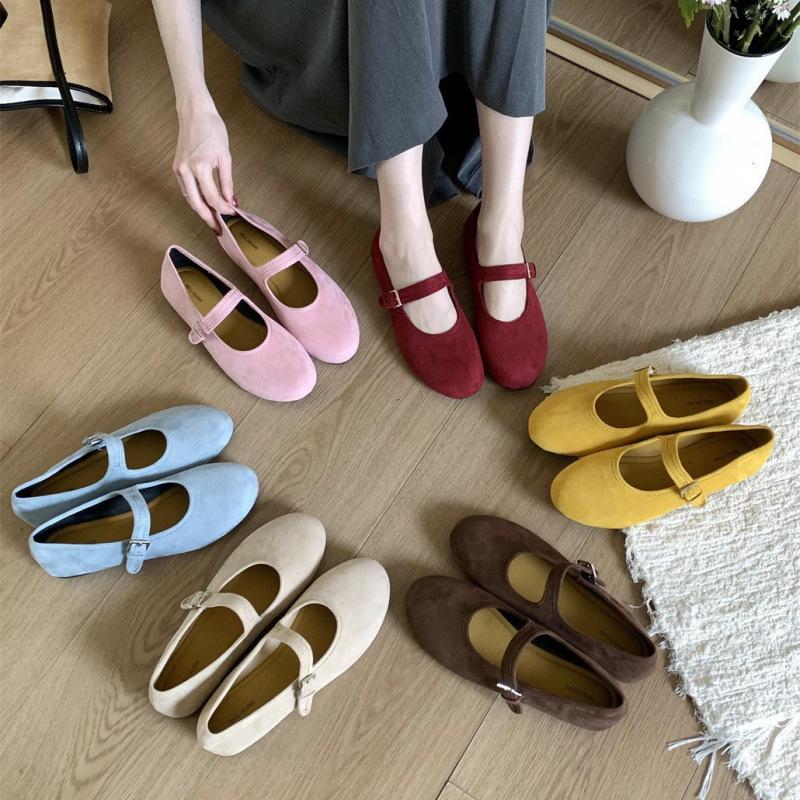 Round head light mouth shoes suede ballet single shoes early spring buckle belt Mary Jane flats ladyshoes
