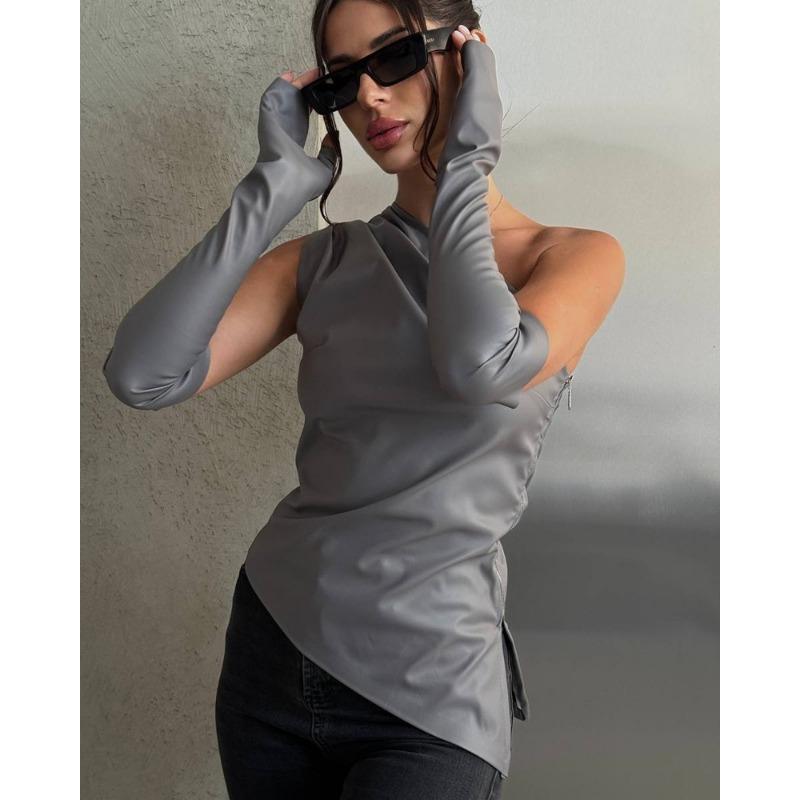 Women's Clothing Sexy Slanted Collar Off-Shoulder Irregular PU Leather Vest Women's Top Sleeve Cover