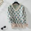 Vintage Loose V-Neck Knitwear Sweater Long Sleeve Print Pullover Top for Autumn Winter