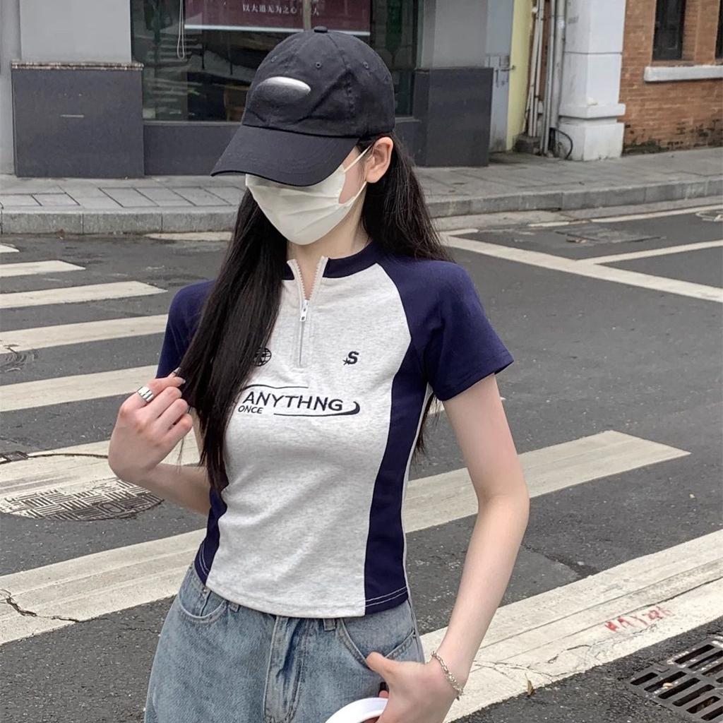 Women Retron T-shirts Short Sleeve Zipper Collars Girls Y2K Tees Street Wear Female Tops