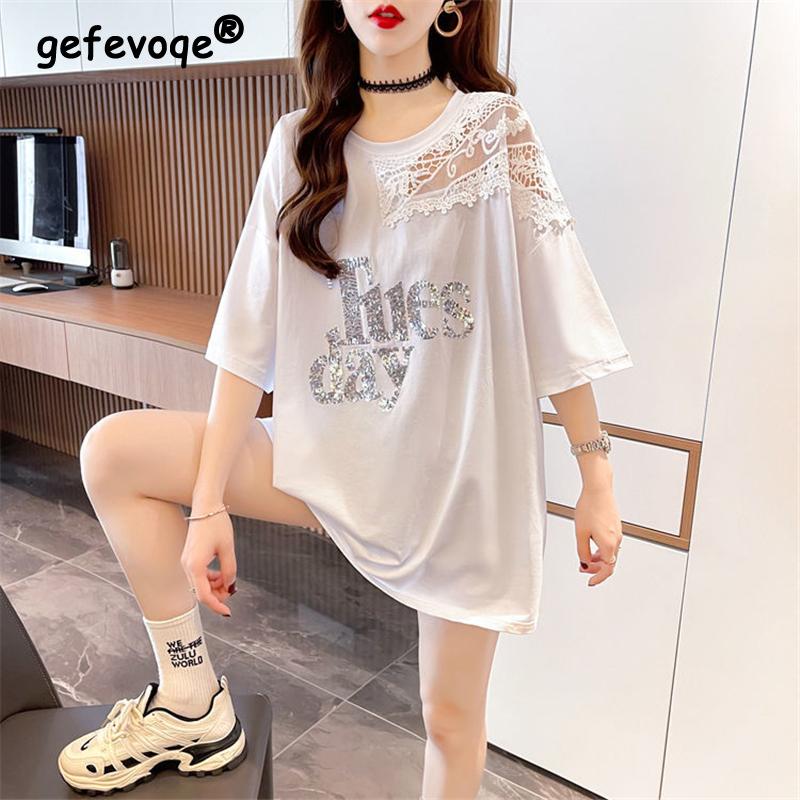 Women Korean Fashion Sexy Lace Patchwork Sequin Oversize T Shirt Summer Black White Short Sleeve Streetwear Tunic Tops Ropa