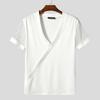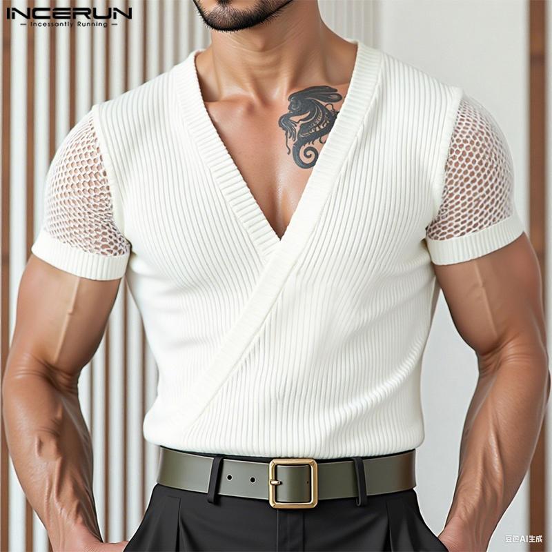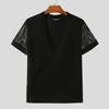 INCERUN Tricouri pentru bărbați cu gât în V, mânecă scurtă, patchwork din plasă, față transparentă cu încrucișare
