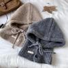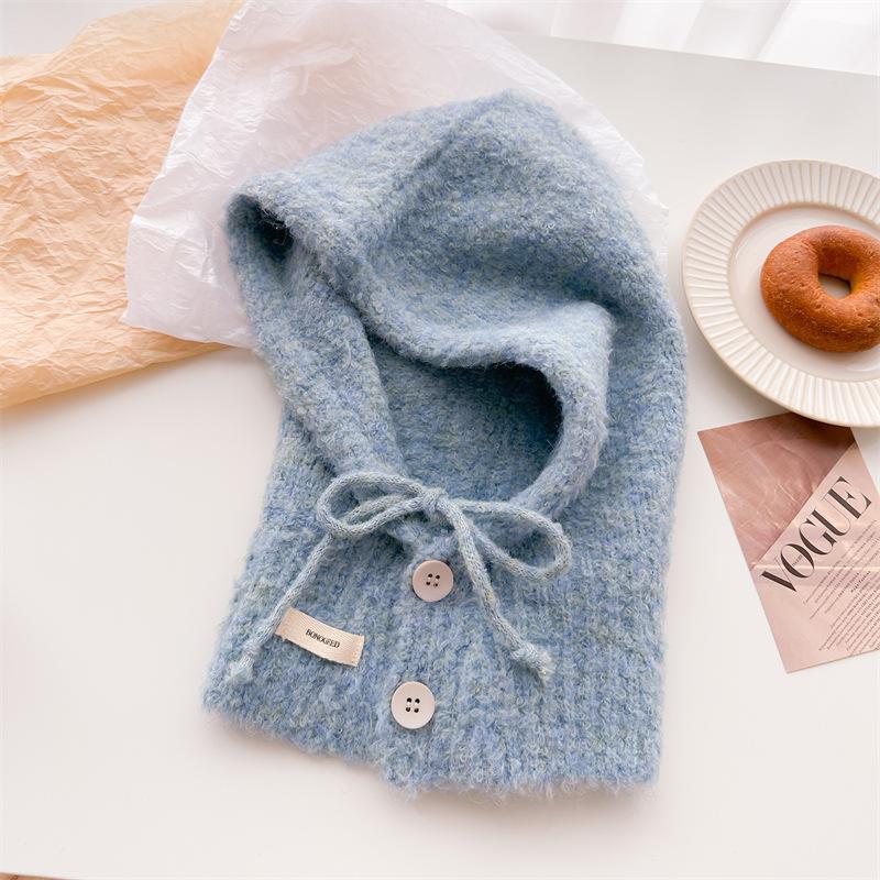 Drawstring button solid color versatile balaclava wool knitted hat winter warm and protective ear hat