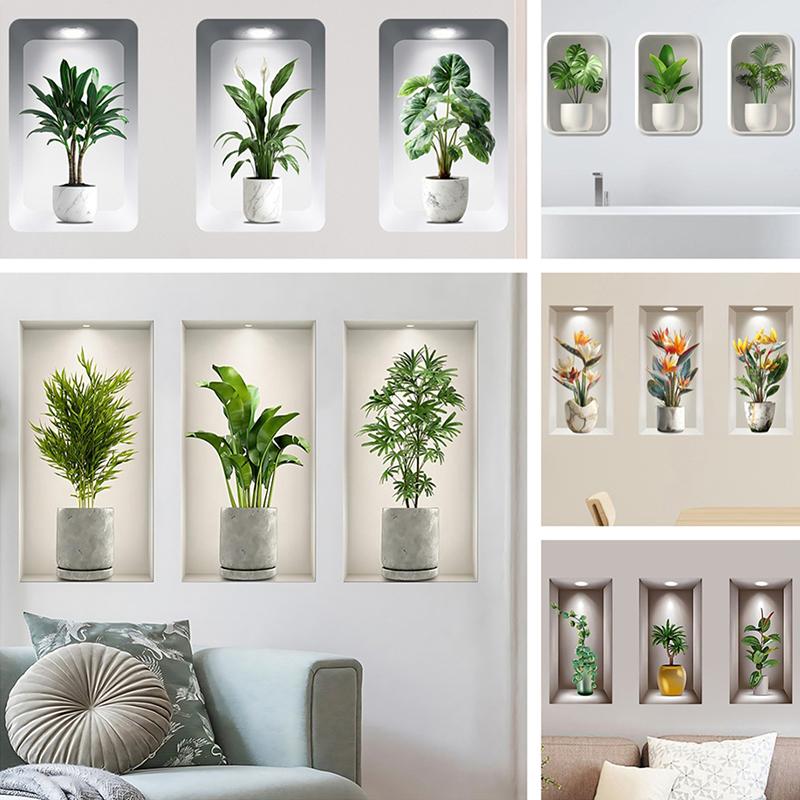 Autocolante de perete 3D, Plantă verde în ghiveci Ferestre false Living Pridvor Decor de perete de fundal Autocolante de perete autoadezive