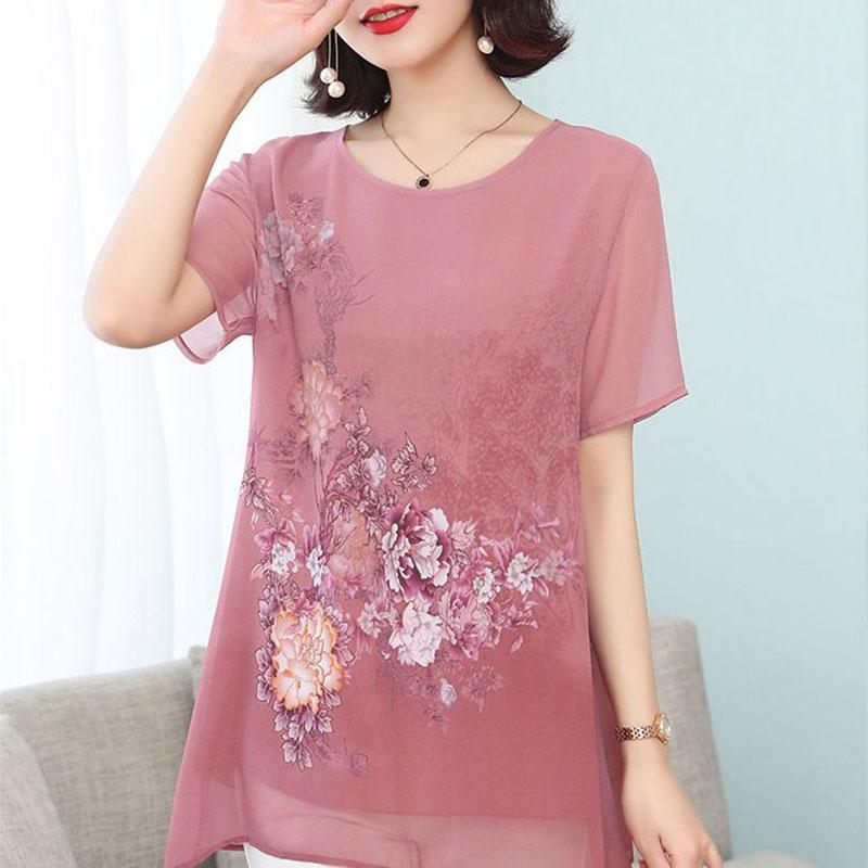 Summer Floral Printed Chiffon Shirt Short Sleeve Female Clothing Loose Stylish Asymmetrical Commute O-Neck Spliced Midi Blouse