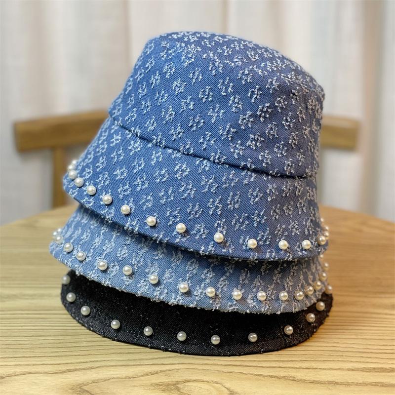 New Retro Washed Denim Pearl Bucket Hat Women's Autumn and Winter Bucket Basin Hat Children