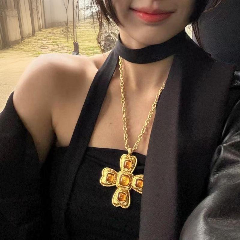 Colier Pandantiv Cruce Metalică Rășină Galbenă Transparentă Stil Retro Lanț Gât Pentru Femei Bărbați Cuplu
