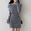 Camolă sexy cu umeri, rever, rochie slim din tricot cu nervuri, fustă scurtă îmbrățișată la șold