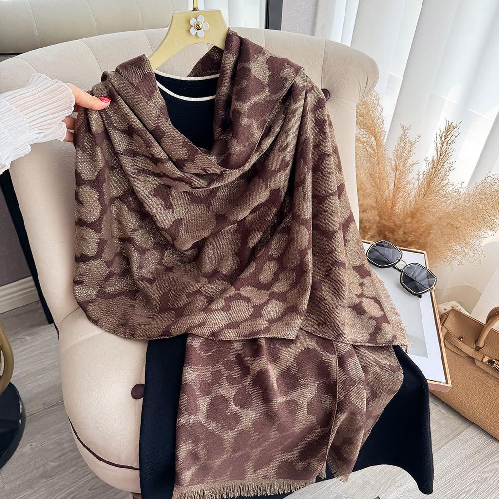 Female European and American Leopard Print Thickened Warm Imitation Cashmere Fringed Cape Double-sided Gold Thread Shawl Autumn and Winter