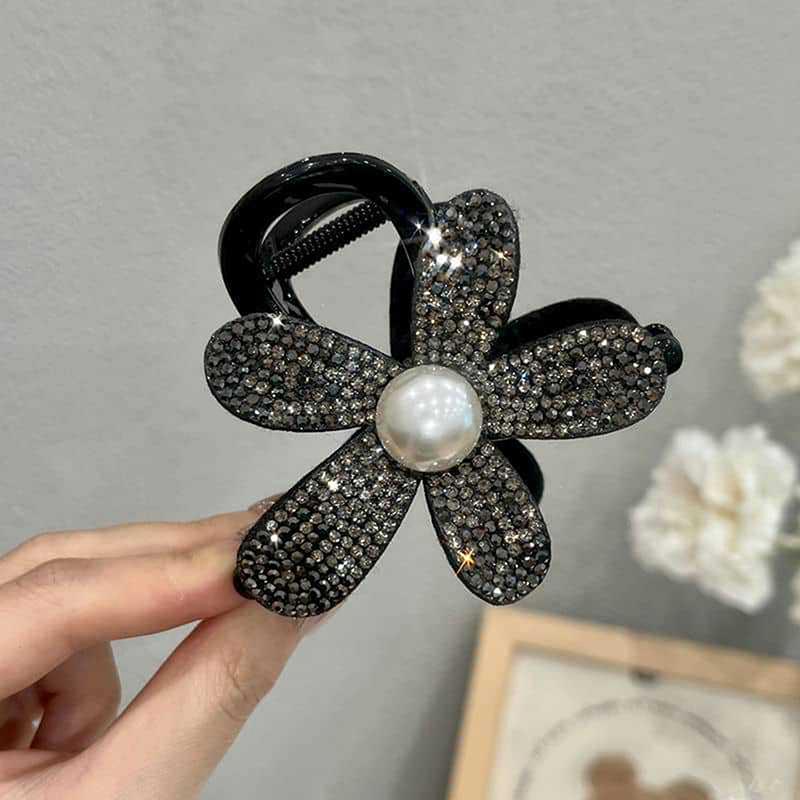 Shiny Flower Hair Claw Clip Headwear Elegant Black Ponytail Shark Clip Hairgrips For Ladies Hair Accessories