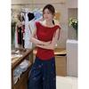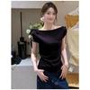 Un Nou Design de Tricou Decolteu Bardot cu Mânecă Scurtă pentru Femei, cu o Bretea Diagonală și un Top Scurt Subțietor
