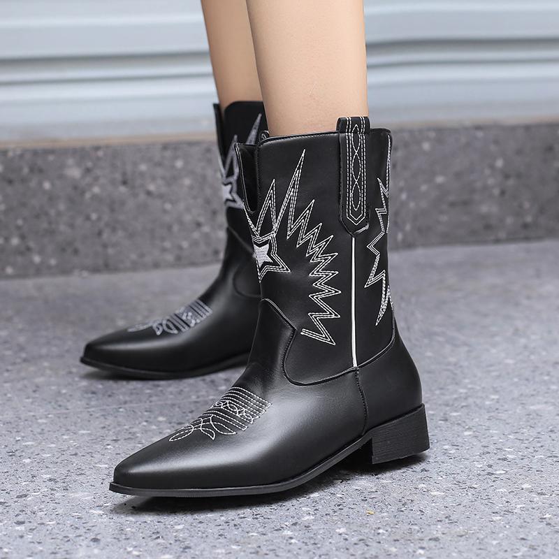 Embroidered Five-Star Women's Short Barrel Western Boots Artificially Embroidered Pointed Toe Plush Lining Slip-On Ankle Boots