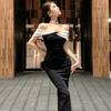 Off-Shoulder Sexy Waist Temperament Pleated Dress Women's Summer Small Dress Long Dress Dress Clothes