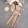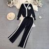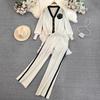 Set de modă: Cardigan tricotat cu mâneci lungi, culoare contrastantă, decolteu în V, set din două piese, talie înaltă, pantaloni cu picior drept, picior larg