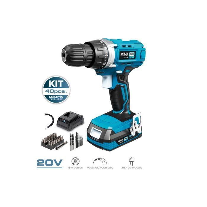 Kit Bormașină Înșurubeuză 20V - Koma Tools - 40 Accesorii - Baterie Li-Ion 2,0 Ah - Mandrin Ø10mm