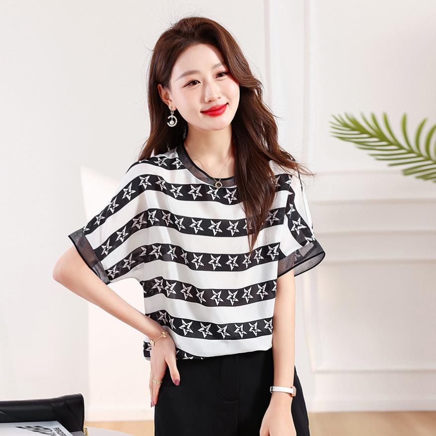 Silk shirt women's large size loose summer new mulberry silk striped short-sleeved top