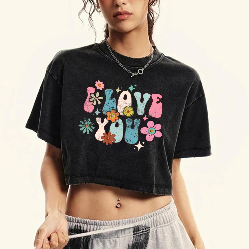 I Love You Colorful Letter Flowers Prints Women Crop Washed T-Shirts Street Short Sleeve Tee Shirt Slim Cotton Clothes