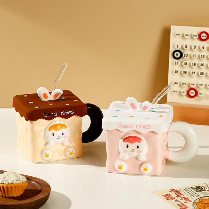 Cana Iepure Tridimensional Drăguță cu Capac Pai Cadou Creativ pentru Fată Cană Ceramică Pătrată pentru Mic Dejun Birou