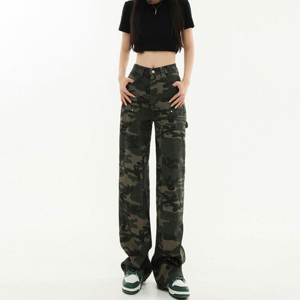American high street camouflage wide-leg jeans women's ins trendy versatile babes high-waisted slim straight floor pants