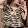 Cămașă Elegantă din Dantelă cu Carouri Vintage, de Vară, cu Mânecă Scurtă, Casual, cu Decolteu în V, Haine Femeie, Stil Coreean Dulce, Bluză cu Șnur și Fundă