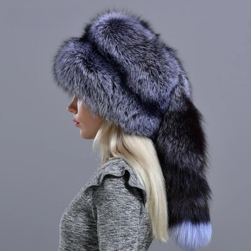 Raglaido real fox fur hats for women winter fashionable stylish Russian thick warm beanie hat natural fluffy fur hat with tail