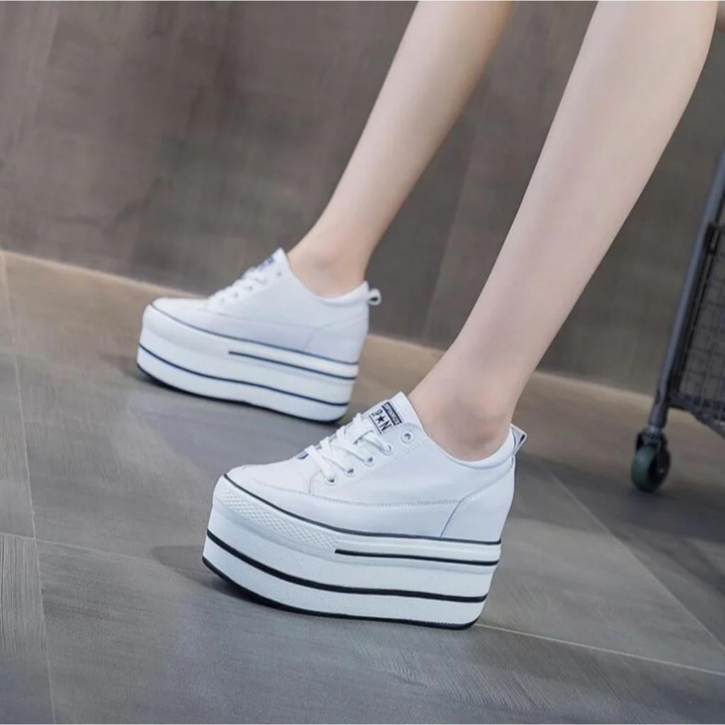 Toamnă 10,5 cm Toc Gros Platformă Balerini Femei Pantofi Casual Piele Naturală Calitate Moale Pantof Casual Adidași Alb Negru