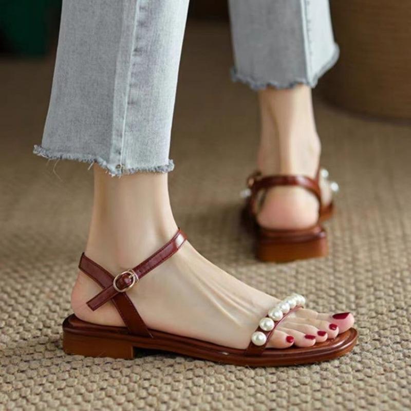 Low Heel Sandals Summer New Square Head Open Toe Pearl Fine Belt Soft Sole Anti-slip Wear-resistant Square Heel Shoes