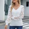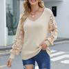 Pulover tricotat pentru femei, cu decolteu în V, cu mânecă lungă, cu îmbinare din dantelă, pulover