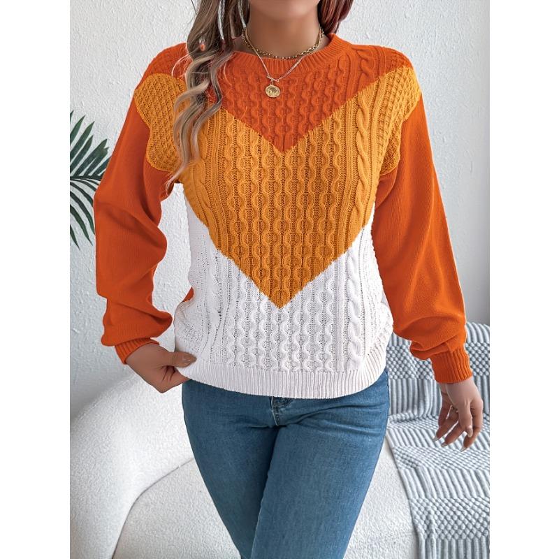 [Pulover cu gât rotund color block] Pulover cu gât rotund color block, Pulover elegant cu mâneci lungi pentru toamnă și iarnă, Îmbrăcăminte pentru femei