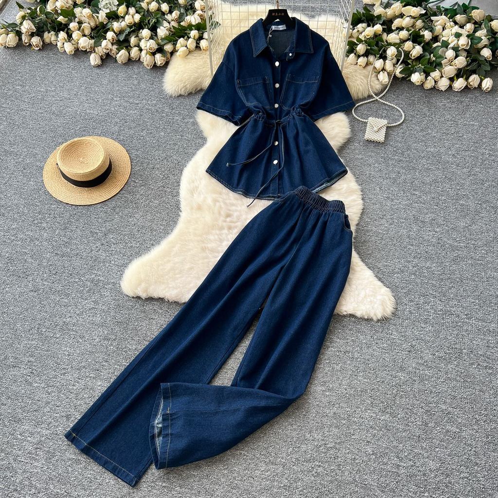 Vintage Spice Girl Style Denim Suit Women's Summer Drawstring Polo Neck Shirt Top Elastic Waist Wide Leg Slim Pants