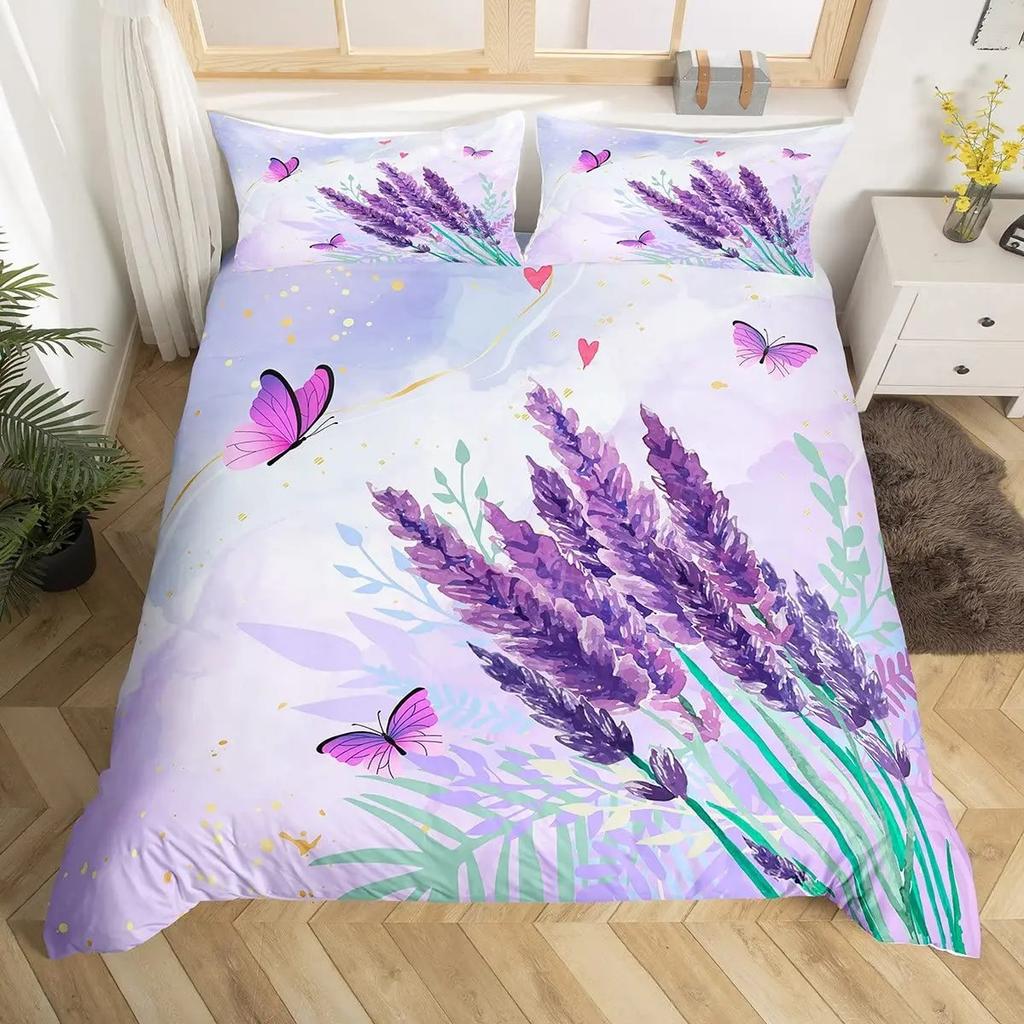 Lavender King Queen Duvet Cover Purple Flower Butterfly Bedding Set Abstract Marble Floral Comforter Cover Polyester Quilt Cover
