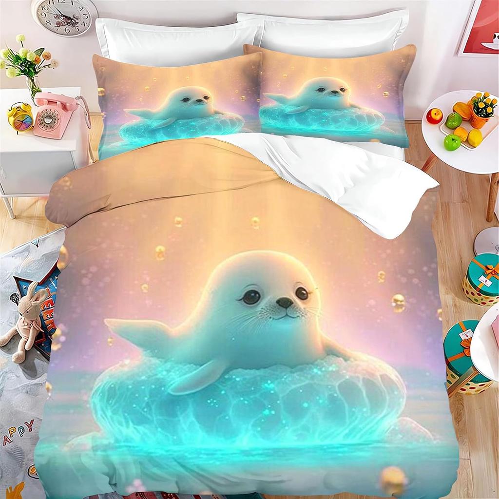 Set de lenjerie de pat cu animale focă pentru copii fete, Set husă de pilotă cu focă de desene animate, Husă de pilotă moale din microfibră cu fețe de pernă 75*50