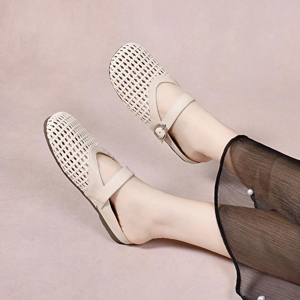 Woven slippers women's outer wear summer new round head hollow casual flat bottom sandals holiday lazy drag