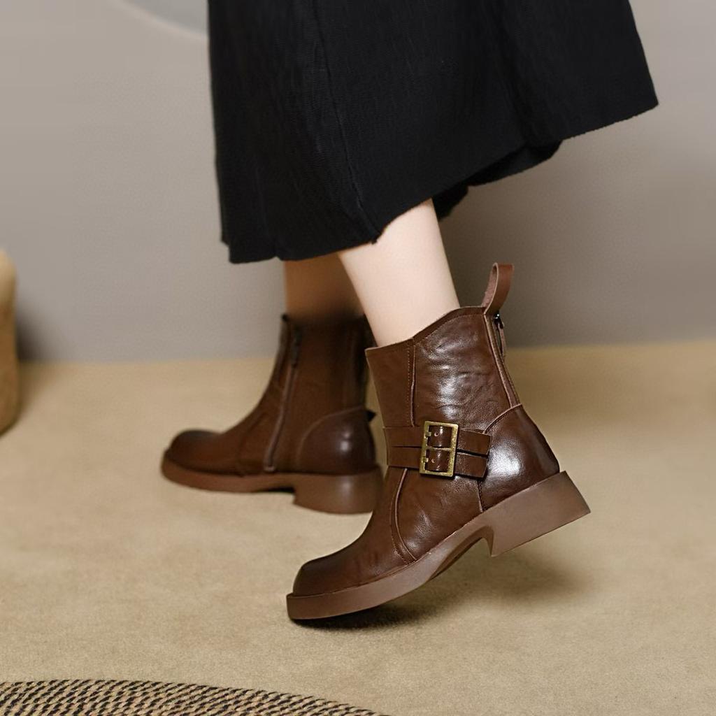 Ghete medii pentru femei, ghete Martin de toamnă și iarnă, noi, cu două rânduri de nasturi, cu vârf rotund și talpă plată, ghete de damă cu toc gros, ghete de damă din piele