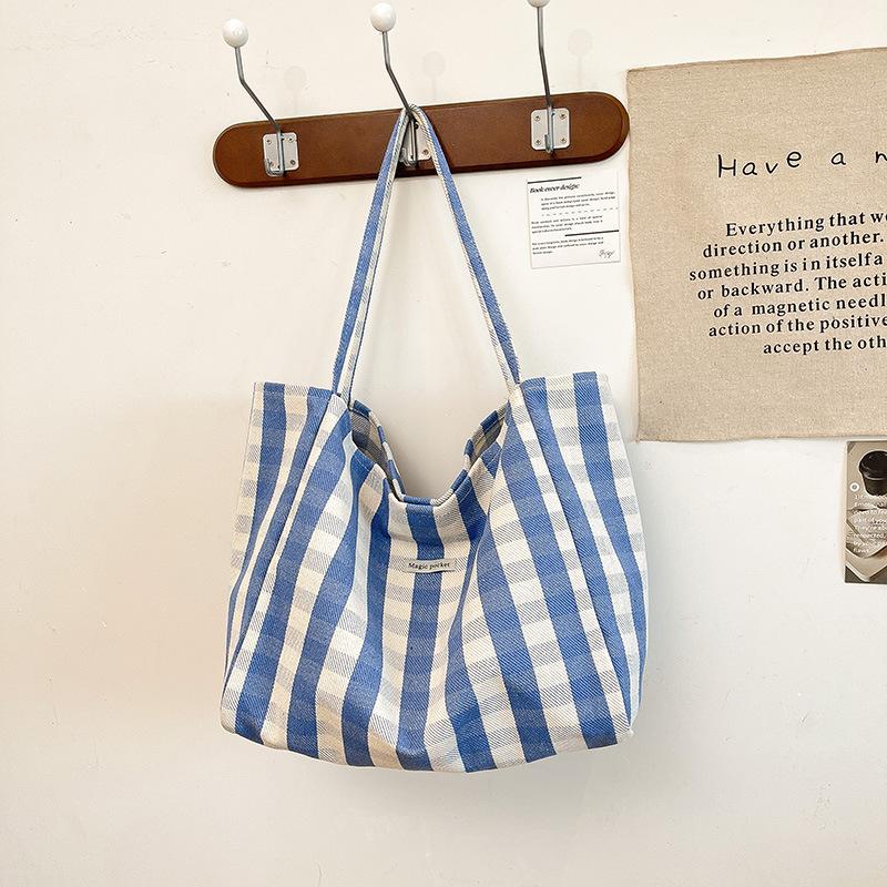 Striped plaid canvas bag women's new trendy fashion college style tote bag large capacity shoulder bag