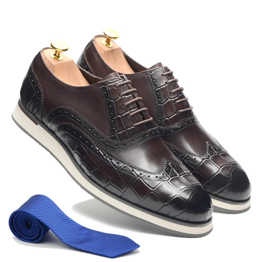 Fashion British Style Men's Flat Sneakers Genuine Cow Leather Wingtip Toe Brogue Oxfords Alligator Print Casual Dress Shoes Male