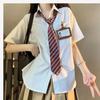 This stylish blouse is perfect for summer, featuring a classic JK uniform style with a modern twist. Made from high-quality polyester, it offers durability and comfort. The blouse has short sleeves, or 1/2 sleeve length, ideal for warm weather, and a turn-down collar for a neat, polished look. The striped pattern adds a playful and youthful touch, making it a versatile addition to any wardrobe.