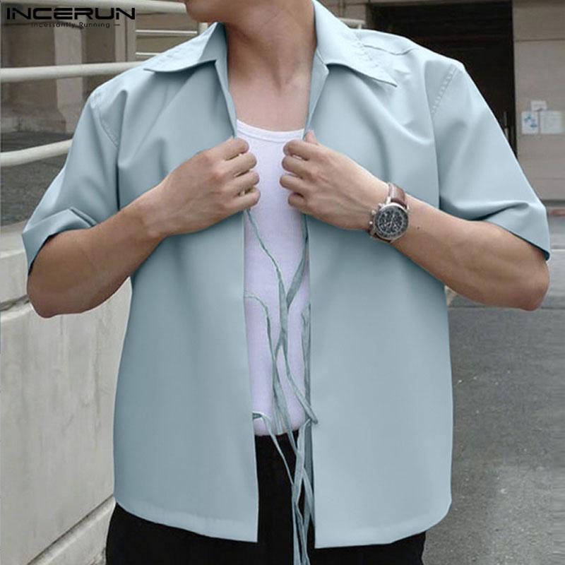 INCERUN Oversized Men Casual Lapel Neck Short Sleeve Bow Knot Solid Color Shirts Tops