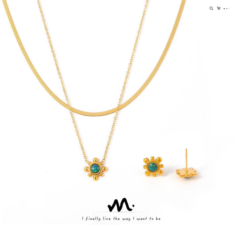 European & American Sunflower Gemstone Earrings & Clavicle Necklace Set, 18K Gold-Plated Titanium Steel