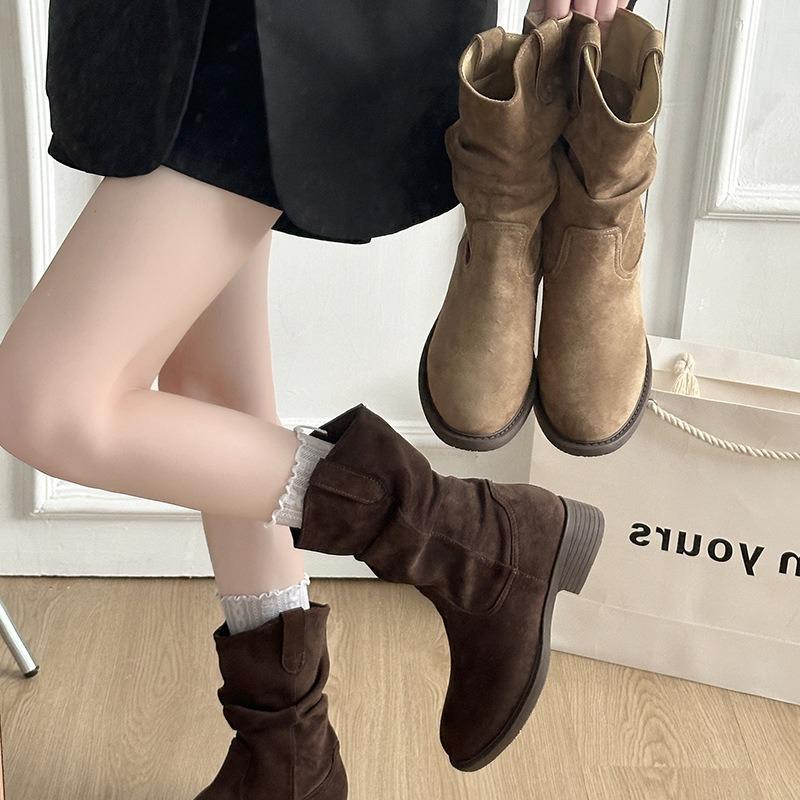 Pleated pile boots new summer thick heel V mouth thin versatile low tube retro western cowboy boots