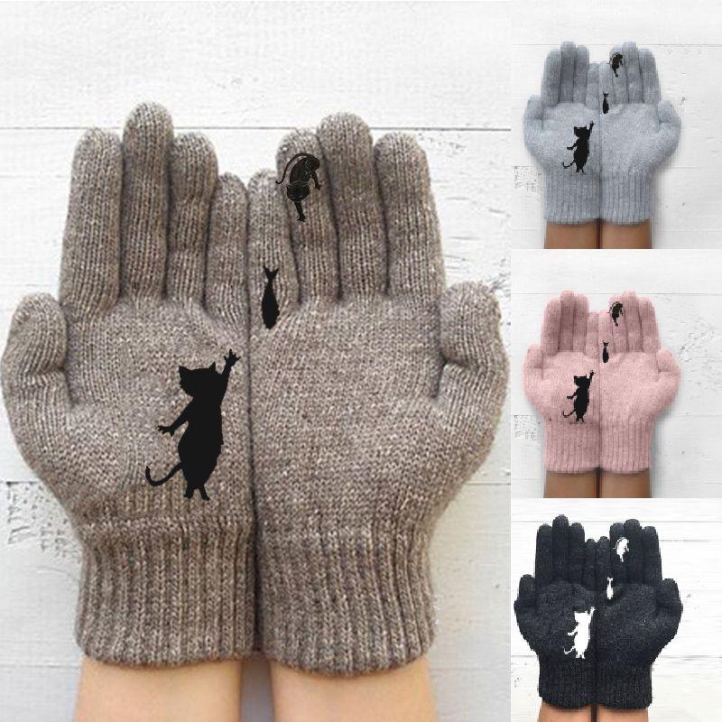 Modă Pisică Femei Și Pește Imprimeu Mănuși Tricotate Iarnă Călduroase Mănuși Complete Degete