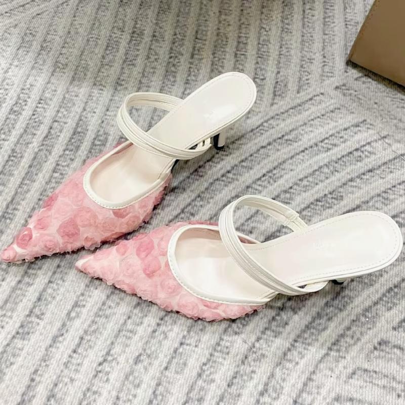 Flower Design Brand High Heel Pumps Women Sexy Pointed Toe Mesh Breathable Slippers Elegant Party Backless Dress Shoe Mule Shoes