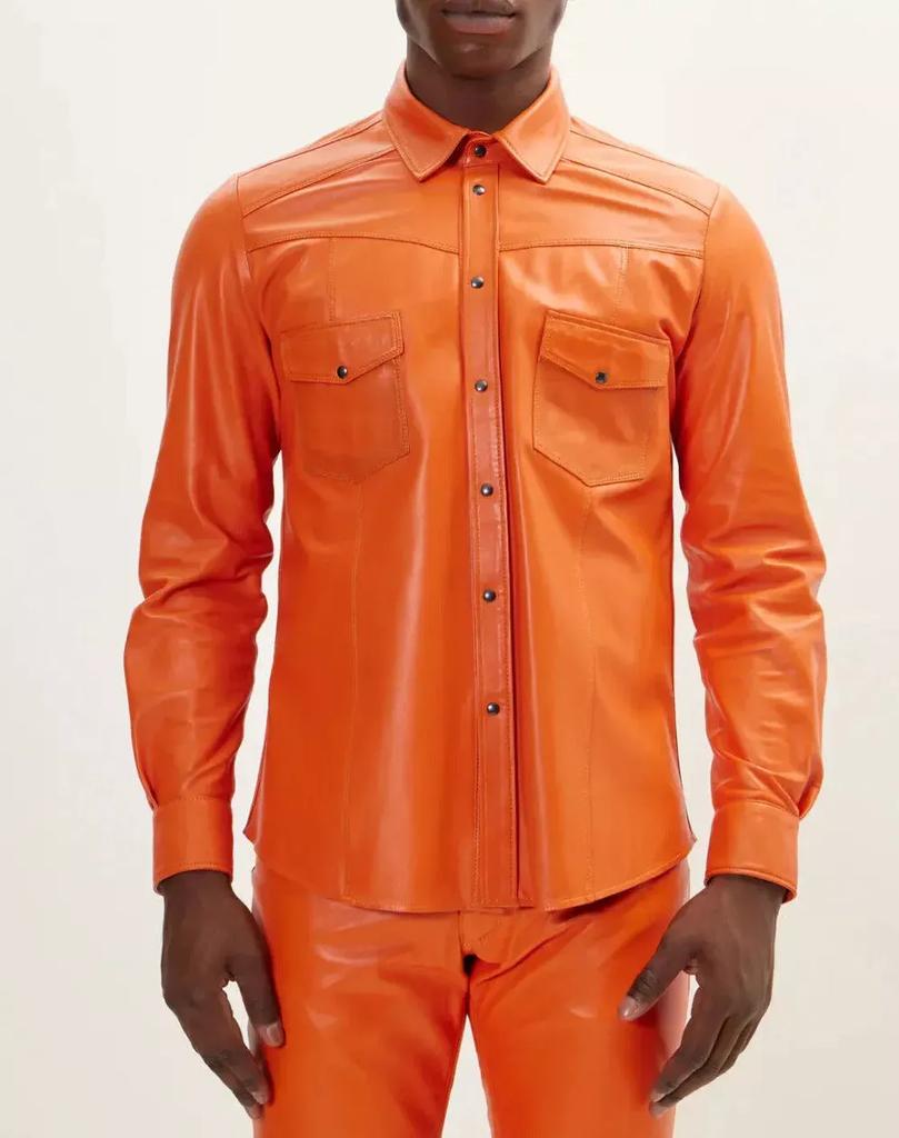 Men Leather Lambskin Orange Classic Handmade Formal Stylish Shirt Casual Party