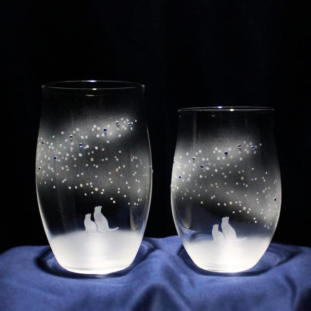 This is the popular Milky Way Glass "L+M Pair Set." These adorable glasses feature sandblasted carvings of cats gazing up at the flowing Milky Way. The Milky Way is softly blurred like a nebula, and within it are many shining blue stars. The blue stars are adorned with three types of rhinestones: sapphire, light sapphire, and sparkling clear crystal, creating the illusion of a starry sky.
