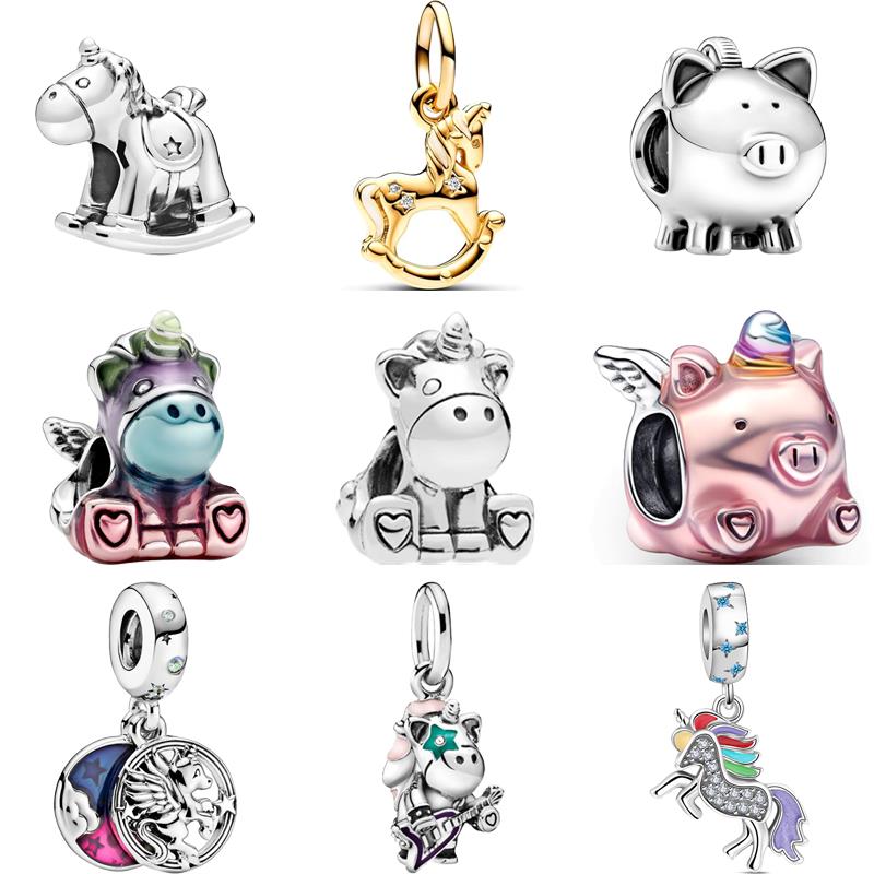 925 Sterling copper Fit Original Pendant Charms Bracelet Women Zircon Colorful Magic Flying Unicorn Pig Dangle Charm DIY Beads