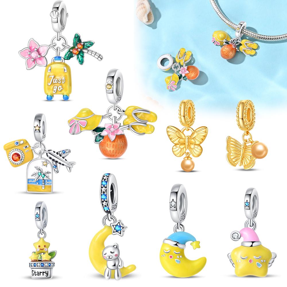 Cute copper Color Glowing Moon & Star Dangle Charm Fits Original Bracelet Women Summer Ocean Beads For Gold Zircon Gift