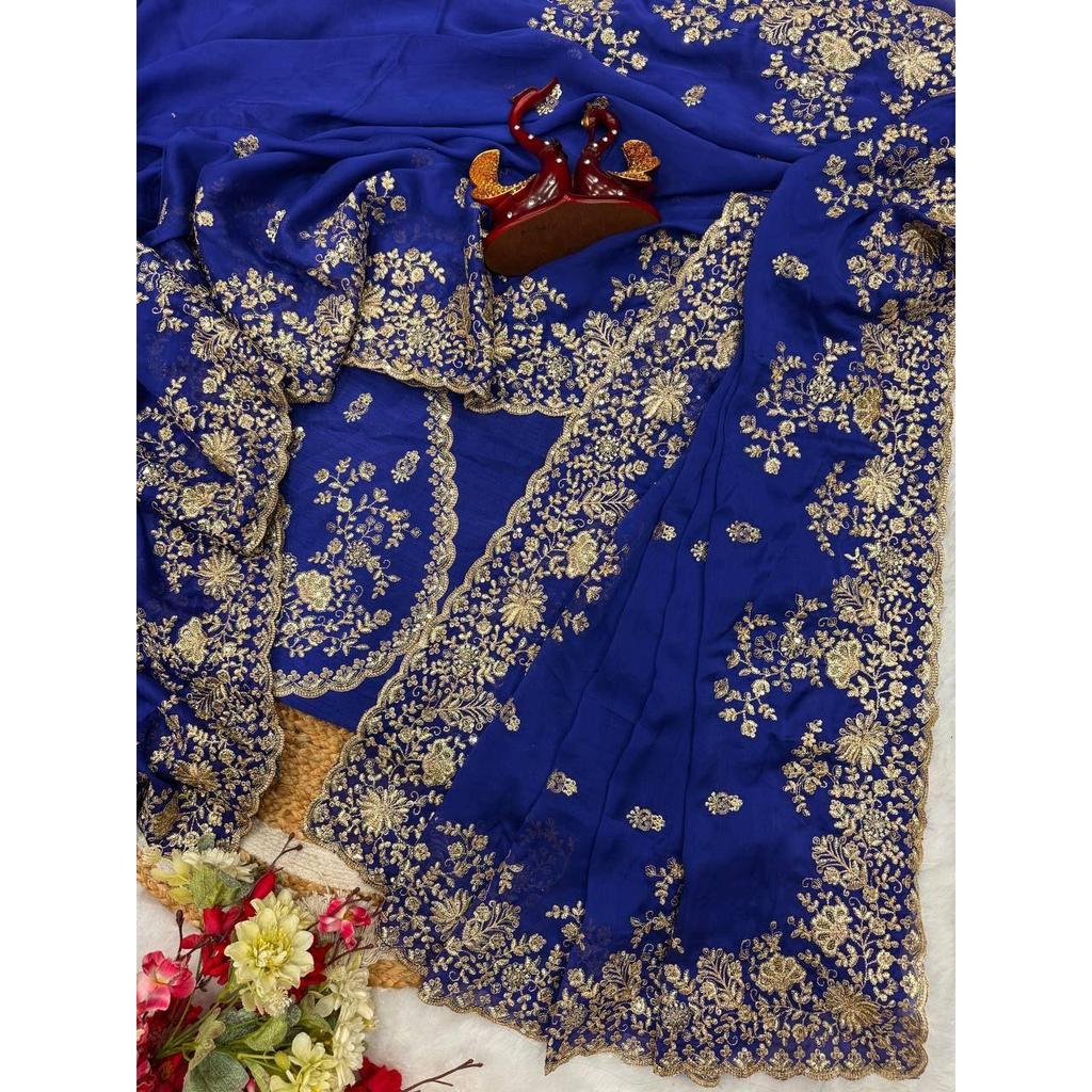 Exudând grație și sofisticare, acest sari brodat cu paiete îmbină frumusețea clasică cu eleganța modernă. Fiecare petală delicată din design spune o poveste de farmec atemporal, făcându-l alegerea perfectă pentru cei care apreciază atât tradiția, cât și stilul contemporan.