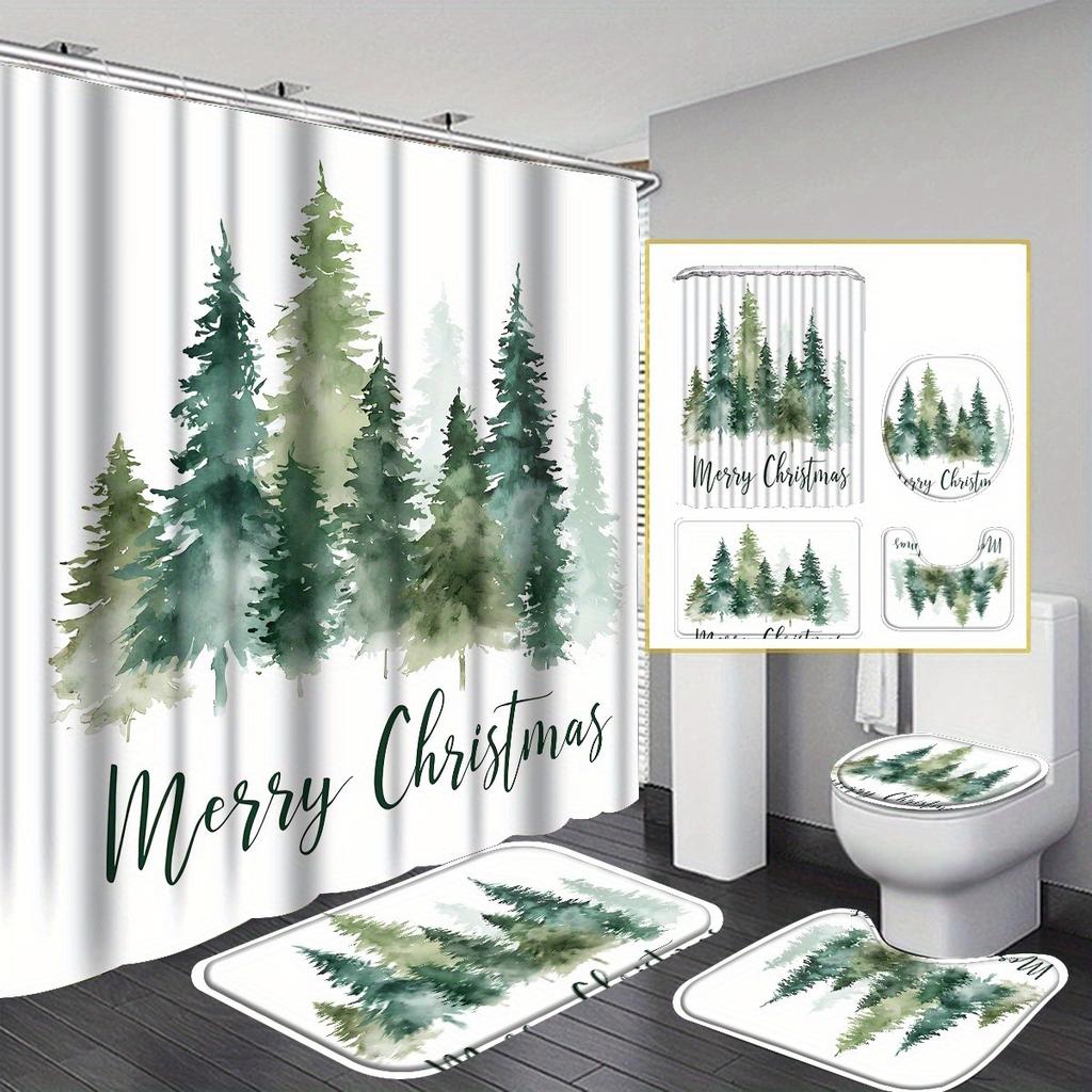 Set Cortină de Duș pentru Baie 4 Bucăți Model Pom de Crăciun Cortină de Baie cu 12 Cârlige Covoare Antiderapante Covoraș pentru Capacul Toaletei Paravan de Baie