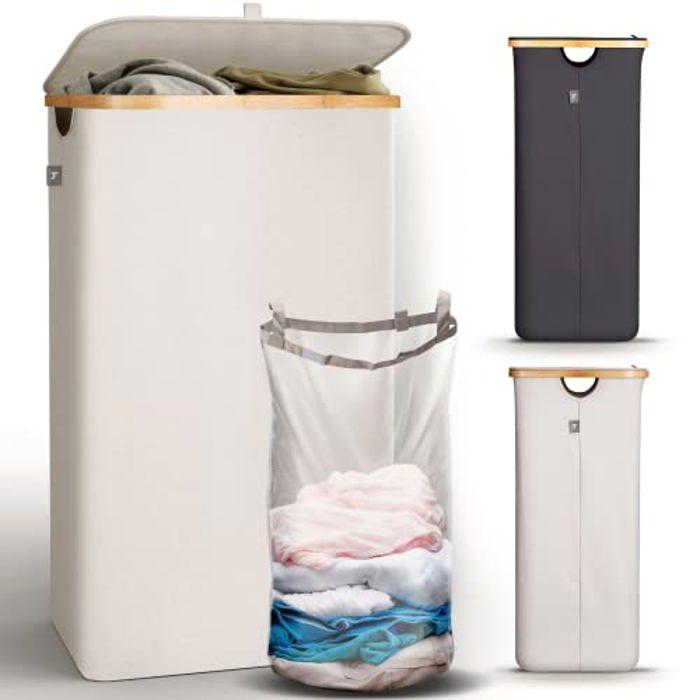 Panier à linge - HENNEZ - Panière Linge Couvercle - 100L - Beige - Poignée Bambou
